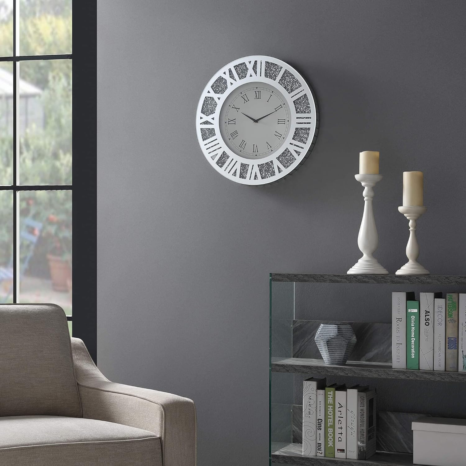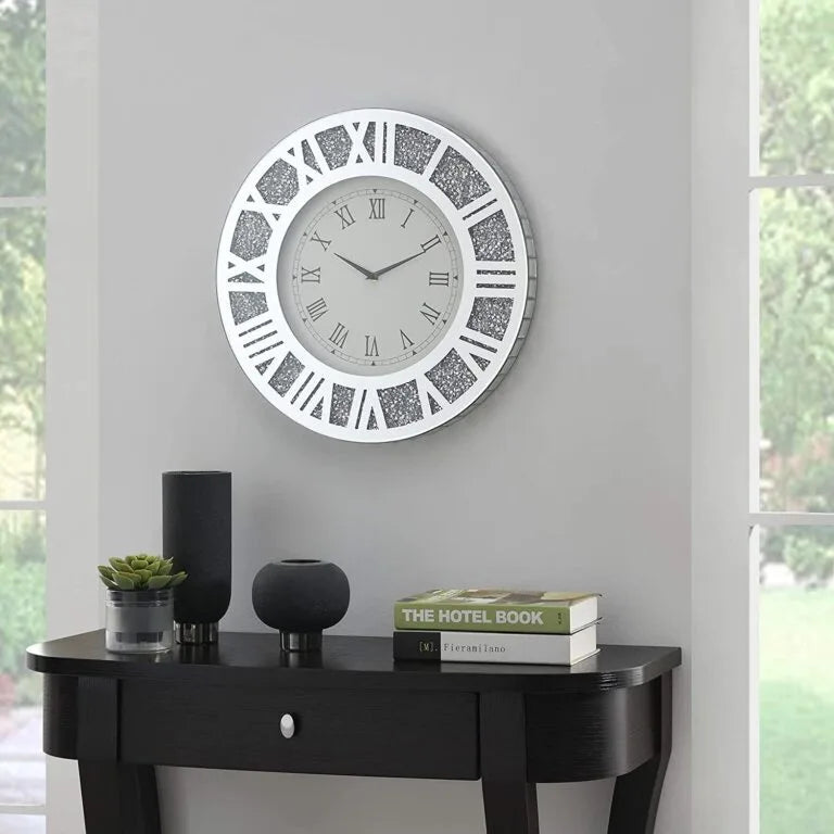 The round shape of the clock mirror adds a sense of harmony and balance to its design, while the crystal diamond accents create a captivating visual spectacle. Each diamond is carefully embedded into the frame, exuding a radiant sparkle that catches the light from every angle.
